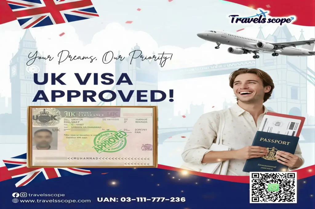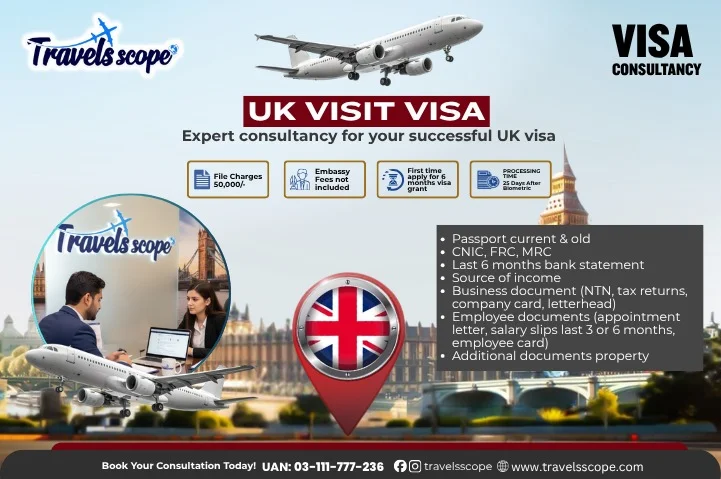 The UK visit visa fee for Pakistani applicants varies based on visa duration and additional service charges. Travel Scope provides complete guidance on the total cost for UK visitor visa.
